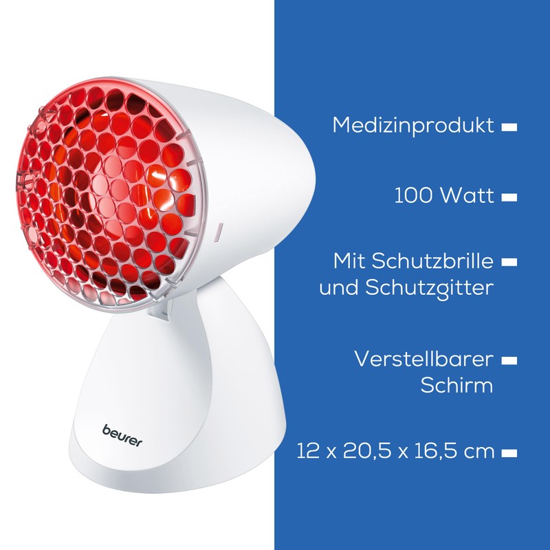 Die wohltuende Wärme der Beurer IL 11 Infrarotlampe kann sowohl bei Erkältungen als auch bei Muskelverspannungen eingesetzt werden. Der 100 Watt starke Infrarotstrahler bietet bei der Anwendung maximale Sicherheit durch Schutzbrille und Schutzgitter. Der verstellbare Lampenschirm besitzt 5 Neigungsstufen für eine optimale Ausrichtung auf den gewünschten Behandlungsbereich. Die Lampe ist ein zertifiziertes Medizinprodukt und in der EU hergestellt. Die Produktmaße betragen 120 x 205 x 165 mm und das Gewicht ca. 320g.