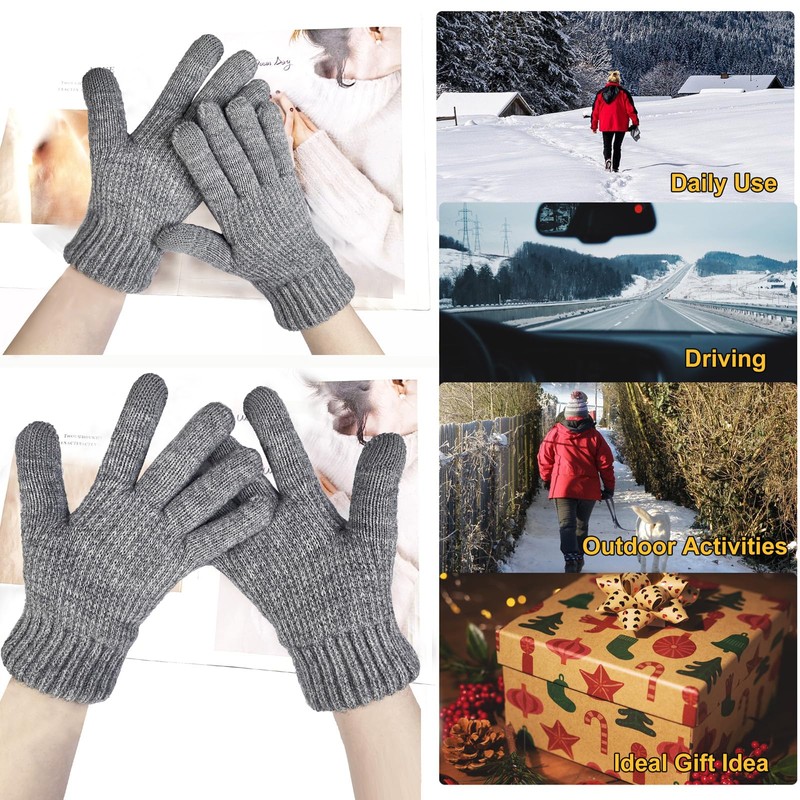 Beurlike 2 Pairs Winter Gloves for Women Wool Warm Knit Touchscreen Texting Snow Fleece Thermal Gloves for Cold Weather(Black+LightGrey)