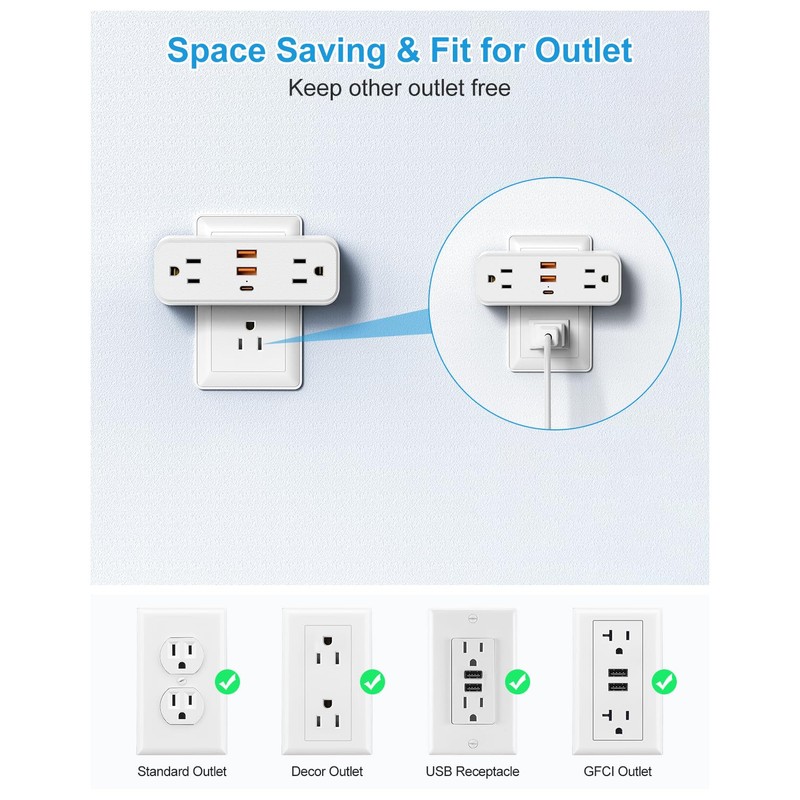 - 【3-Side Wide Spacing Outlet Adapter】3-side design AC outlets can fit 4 large plugs at the same time without blocking. Only occupy a single wall outlet and keep other outlets free. Fits for Standard Outlet/ Decorative Outlet/ USB Outlet/GFCI Outlet