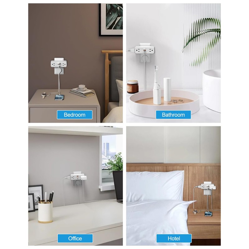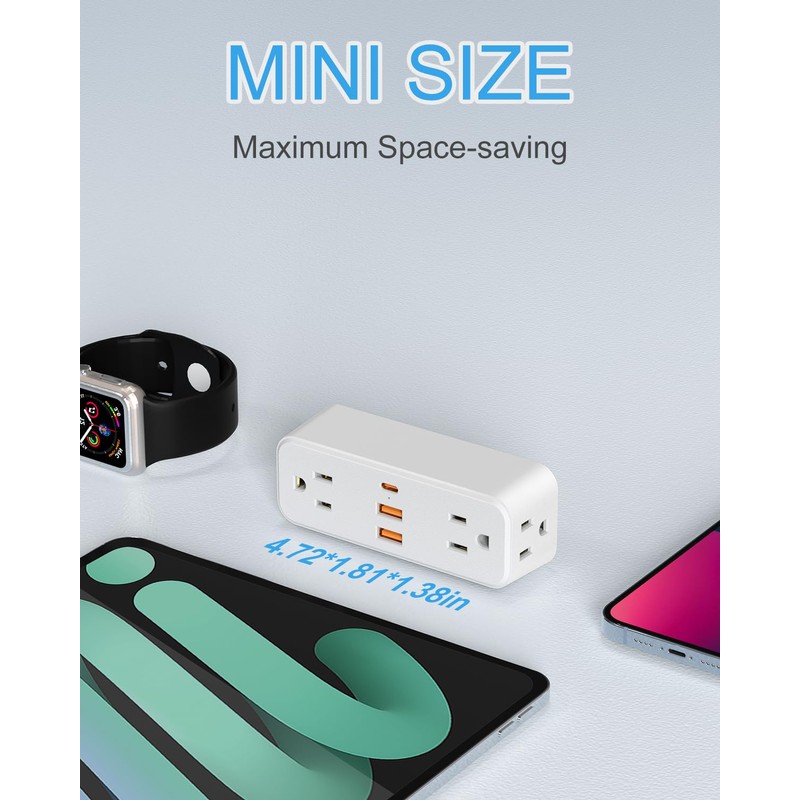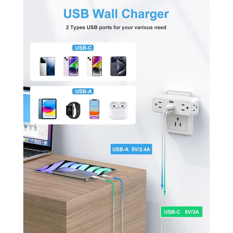 - 【7 IN 1 USB Wall Outlet Extender】This wall plug extender could turn 1 socket into 4 AC outlets and 3 USB ports(1 USB C), can charge 7 devices simultaneously, you can use it in any indoor place such as kitchen, office and dorm room