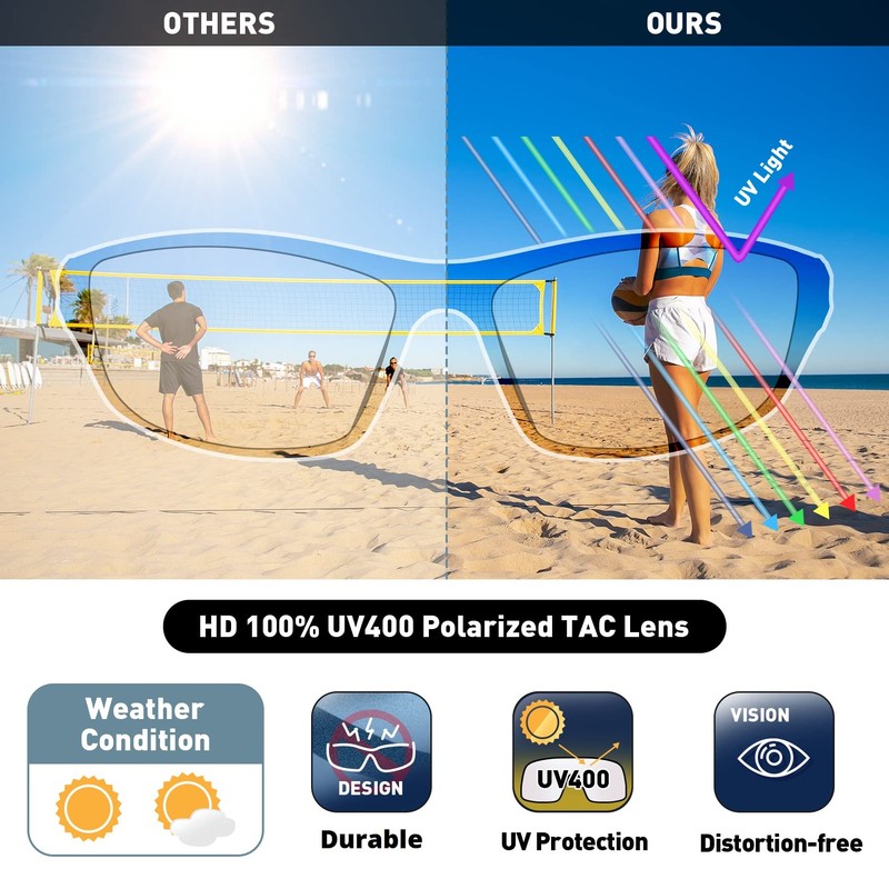 - ⭐KEY FEATURES - Polarized lenses reduce glare - Impact resistant TAC lenses protect your eyes from flying objects - Block 100% of the harmful UVA and UVB rays - Lightweight, durable, and comfortable TR90 frames with spring hinges