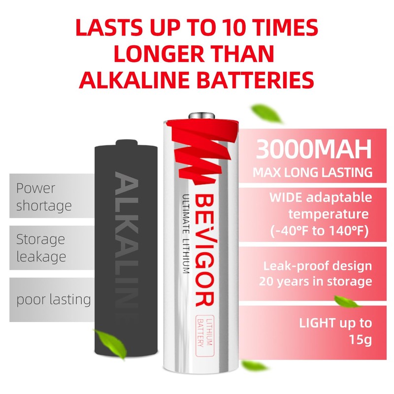 - 【Basic parameters】— 24-pack of Bevigor lithium 3000mAh 1.5V with light weight(15g/1pc)life-span(10 years) AA batteries, perfect to power your electronic devices, remote controls and other household appliances. Bevigor provide extremely perfect packaging and strong storage time. Prevent accidental drop or short circuit, and provide more secure protection for the battery. 10-year battery storage life for long-term backup energy.
