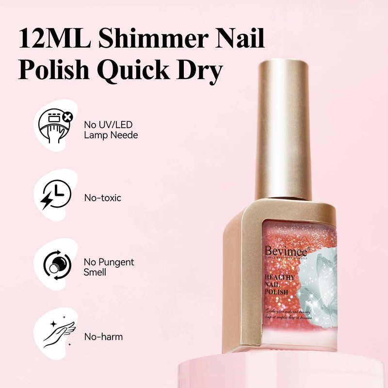- Quick Dry Glitter Nail Polish: Bevimee nail polish an be colored and air dries quickly, does not require any other tools such as UV lamps, getting the desired manicure effect in a few minutes