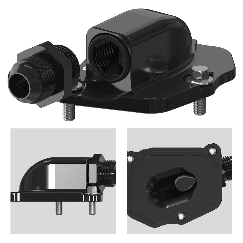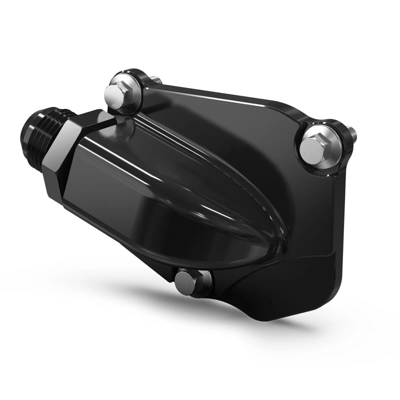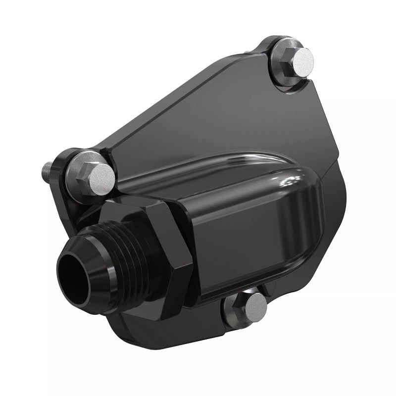 -ORB10 female billet tensioner drain port and fitting, allowing connection using standard AN10 hose and fittings.