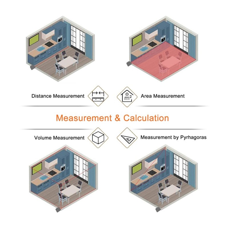 5. Easy to Use: The tape measuring tool can measure area, volume and ticking in single or continuous measurements. Meanwhile, it has high elasticity and toughness, aluminum alloy and ABS shell, anti slip and anti drop.