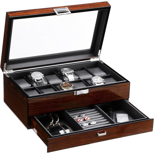 BEWISHOME 12 Watch Box with Valet Drawer, Luxury Watch Case,Watch Organizer for Mens Accessories with Real Glass Top,Metal Hinge, Brown SSH02Y