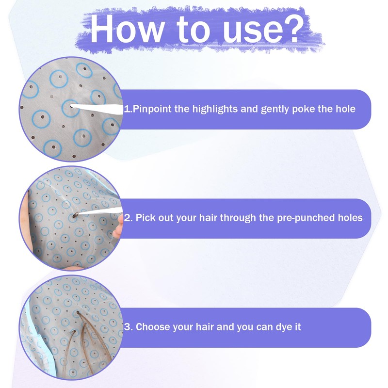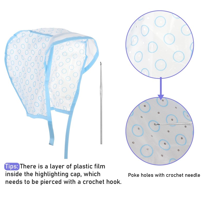 - 【Easy to Use】Put on the highlighting cap and tie the attached ties together at the neck for a secure fit, use the hook needle to poke through holes and pick out the hair that needs highlighting according to your preference, and then you can start your hair dyeing