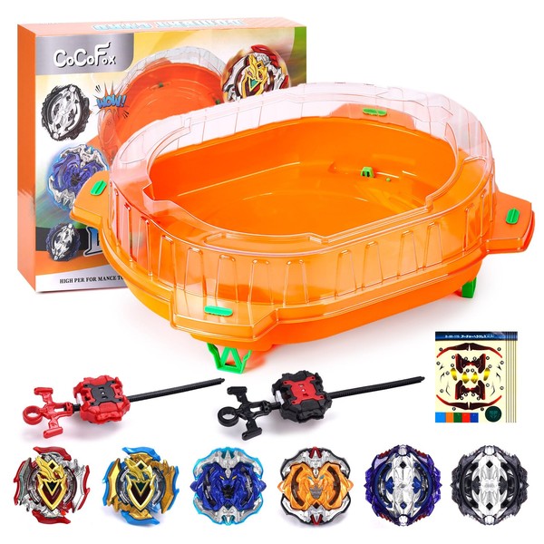 COCOFOX Battling Top Burst Toy Set, 6 Battling Tops 2 Launchers and 1 Stadium, Toys for 6 Year Old Boys & Girls & Up(Orange)