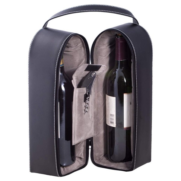 - The set features compartments for two bottles and includes a bar tool with corkscrew, bottle cap opener & foil