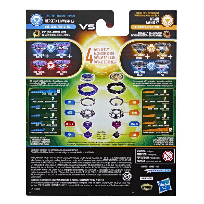 - 2 CUSTOMIZABLE TOPS: Includes Beyblade Burst QuadDrive left-spin Wrath Fafnir F7 G01 QD03 TA23-Q S03 and right-spin Berserk Linwyrm L7 G05 QD05 TB15-Q A04 tops. Customize to Core and Apex mode, then Core+ and Apex+ mode to change top type
