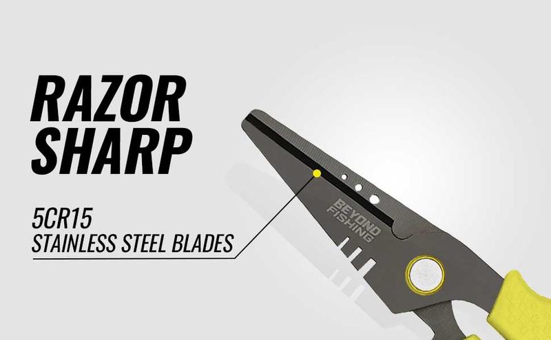 5CR15 STAINLESS SHARP BLADES The super sharp 5CR15 Stainless Steel cutting blades are serrated to make cutting braided line, bait, and fish easy in both fresh and saltwater conditions. It also cuts through mono, fluorocarbon, and certain steel wire.