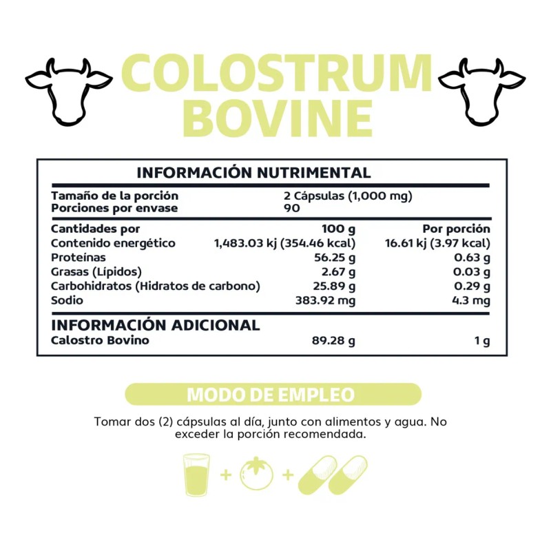 • Presentamos Beyond Vitamins Calostro Bovino 1000 mg Grass Fed, un suplemento alimenticio de alta calidad diseñado para proporcionarte una fuente concentrada de nutrientes esenciales. Elaborado a partir de calostro bovino de vacas alimentadas exclusivamente con pasto, este producto ofrece una fórmula rica y potente, perfecta para complementar tu rutina diaria. Calostro Bovino Grass Fed: Un ingrediente natural y poderoso El Calostro Bovino es conocido por ser una fuente rica en proteínas y compuestos bioactivos, brindando un apoyo ideal para tu bienestar general. Cada porción de 2 cápsulas vegetales contiene 1000 mg de calostro puro, cuidadosamente procesado para conservar su calidad natural y máxima efectividad. Calidad Garantizada en Cada Lote En Beyond Vitamins, priorizamos la calidad en cada paso. Nuestro calostro bovino proviene de vacas alimentadas con pasto, lo que garantiza un suplemento libre de aditivos artificiales. Fácil de Integrar en Tu Rutina Diaria Nuestras cápsulas vegetales están diseñadas pensando en tu conveniencia. Son fáciles de tragar y están perfectamente dosificadas, haciéndolas un complemento ideal para cualquier estilo de vida. Ya sea que estés en movimiento o en casa, Beyond Vitamins Calostro Bovino Grass Fed se adapta a ti, permitiéndote disfrutar de sus beneficios sin complicaciones. Más Que un Suplemento, Una Experiencia Beyond Vitamins no es solo una marca, es un compromiso con tu bienestar. Desde el momento en que abres el envase con su sello de garantía, hasta el último uso, estamos dedicados a ofrecerte una experiencia inigualable. Aviso legal