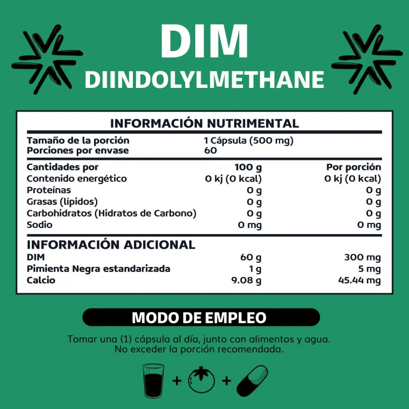 - Suplemento de DIM (Diindolilmetano) con Piperina de Beyond Vitamins, una fórmula de alta pureza diseñada para optimizar la absorción y biodisponibilidad. Cada cápsula contiene 300 mg de DIM combinado con Piperina, ofreciendo una solución eficaz y cuidadosamente formulada para complementar tu estilo de vida. Alta Concentración con Mayor Absorción El DIM es un compuesto reconocido por sus múltiples beneficios, y en combinación con Piperina, se garantiza una absorción óptima para resultados efectivos. Calidad Premium en Cada Cápsula Ingredientes de Primera Calidad: Elaborado sin aditivos innecesarios, utilizando únicamente ingredientes de la más alta calidad. Tecnología VCaps: Cápsulas vegetales aptas para veganos, ideales para diversas preferencias alimenticias. Libre de OMG y Conservantes Artificiales: Diseñado para quienes valoran la pureza y la transparencia en sus suplementos. Fácil de Incorporar en tu Rutina Gracias a su presentación práctica y dosis cuidadosamente medida, este suplemento es fácil de integrar en tu día a día, brindando comodidad y confianza en cada toma. Más Que un Suplemento, Una Elección Inteligente El DIM con Piperina de Beyond Vitamins no solo cumple con los estándares más altos de calidad, sino que también ofrece una fórmula diseñada para maximizar los beneficios de cada ingrediente. Ideal para quienes buscan un suplemento bien formulado que se adapte a sus necesidades. Aviso legal