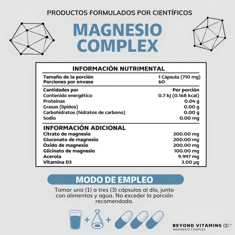Beyond Vitamins | Magnesio Complex | CON 4 MAGNESIOS: Citrato de Magnesio, Glicinato de Magnesio, Gluconato de Magnesio y Óxido de Magnesio | Magnesium Suplemento Alimenticio - 60 cápsulas
