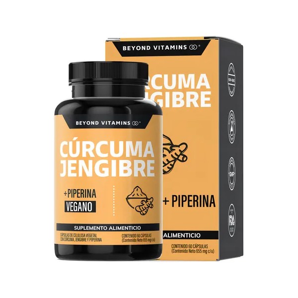 - Presentamos Beyond Vitamins Cúrcuma + Jengibre, la combinación perfecta de ingredientes premium diseñada para elevar tu rutina diaria a nuevos niveles de vitalidad. Cada porción contiene 1000mg de raíz de cúrcuma y 300mg de jengibre, dos de los tesoros más valiosos de la naturaleza, potenciados con extracto de pimienta negra (piperina) para una absorción superior. Cúrcuma y Jengibre: Una Sinergia Perfecta La cúrcuma y el jengibre son conocidos desde hace siglos por sus propiedades excepcionales y su capacidad para complementarse entre sí. La cúrcuma, con su característico color dorado, ha sido venerada por sus múltiples beneficios y su papel en diversas culturas. El jengibre, con su sabor picante y refrescante, añade una dimensión adicional de bienestar. Juntos, forman una pareja imbatible que te ayuda a enfrentar el día con energía y vitalidad. Absorción Mejorada con Piperina La inclusión de extracto de pimienta negra (piperina) en nuestra fórmula no es casualidad. La piperina aumenta la biodisponibilidad de la cúrcuma y el jengibre en un impresionante 2000%, asegurando que tu cuerpo absorba y utilice al máximo cada ingrediente. Esto significa que obtienes más de lo que realmente importa, en cada cápsula. LOS SUPLEMENTOS BEYOND VITAMINS SON: