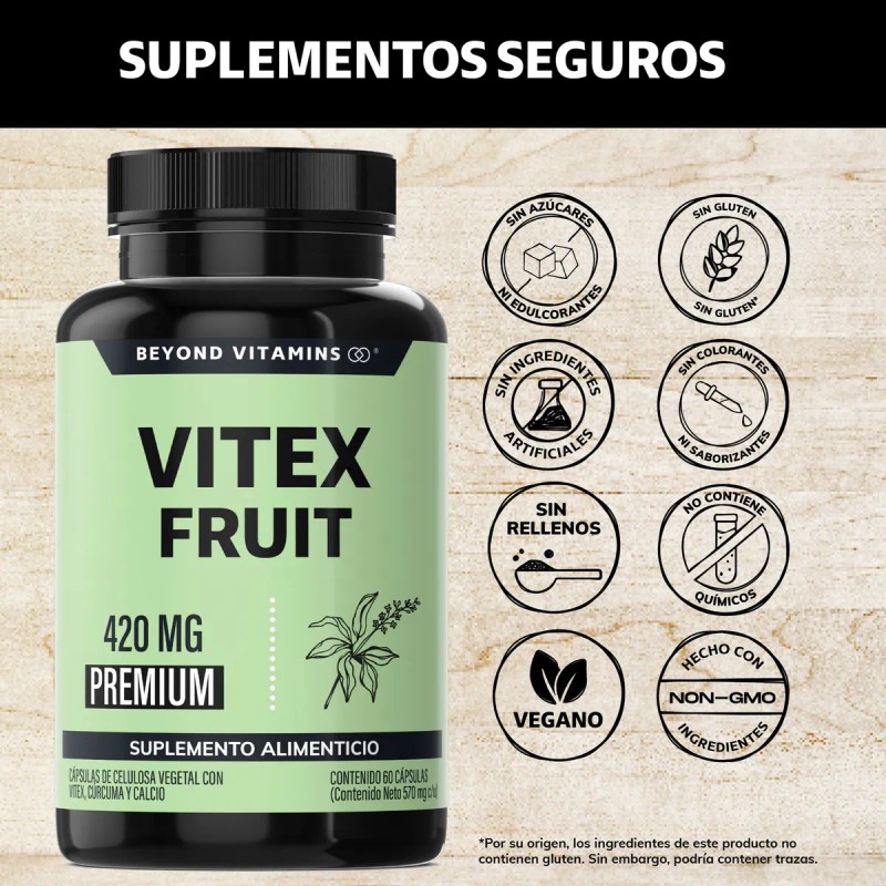 - Cada cápsula de Beyond Vitamins contiene 420 mg de polvo de Vitex, ofreciendo una cantidad superior en comparación con otros suplementos del mercado. Esta dosis elevada te asegura que estás obteniendo lo mejor de esta planta tradicional en cada cápsula para maximizar sus beneficios. Además del Vitex, nuestra fórmula está enriquecida con cúrcuma, conocida por sus propiedades beneficiosas, y calcio, un mineral esencial para el cuerpo. Esta combinación de ingredientes potencia los efectos del Vitex, brindándote una opción completa y equilibrada para tu bienestar. Este suplemento está elaborado con cápsulas de celulosa vegetal, completamente veganas y sin ingredientes de origen animal, lo que lo convierte en una opción ideal para cualquier estilo de vida. Libre de conservantes y aditivos artificiales, Beyond Vitamins Vitex es una opción natural y saludable para complementar tu rutina diaria. Con una cápsula diaria, nuestro Vitex 420 mg es fácil de incorporar en tu rutina diaria. Las cápsulas son sencillas de tomar y están dosificadas para que puedas disfrutar de sus beneficios sin complicaciones, ya sea en casa o en movimiento. Beyond Vitamins no es solo un suplemento, es una experiencia de bienestar diseñada para facilitar tu día a día. Disfruta de los beneficios de Vitex, cúrcuma y calcio en una fórmula completa, creada pensando en tu comodidad y en ofrecerte una solución natural y efectiva. LOS SUPLEMENTOS BEYOND VITAMINS SON: