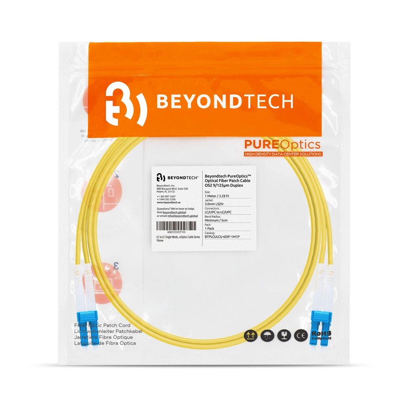 • This Beyondtech Fiber OS2 9/125 LC/LC Fiber Patch Cord conforms with TIA/EIA 492AAAA and IEC60793-2-10 A1b standards and complies with RoHS specifications.