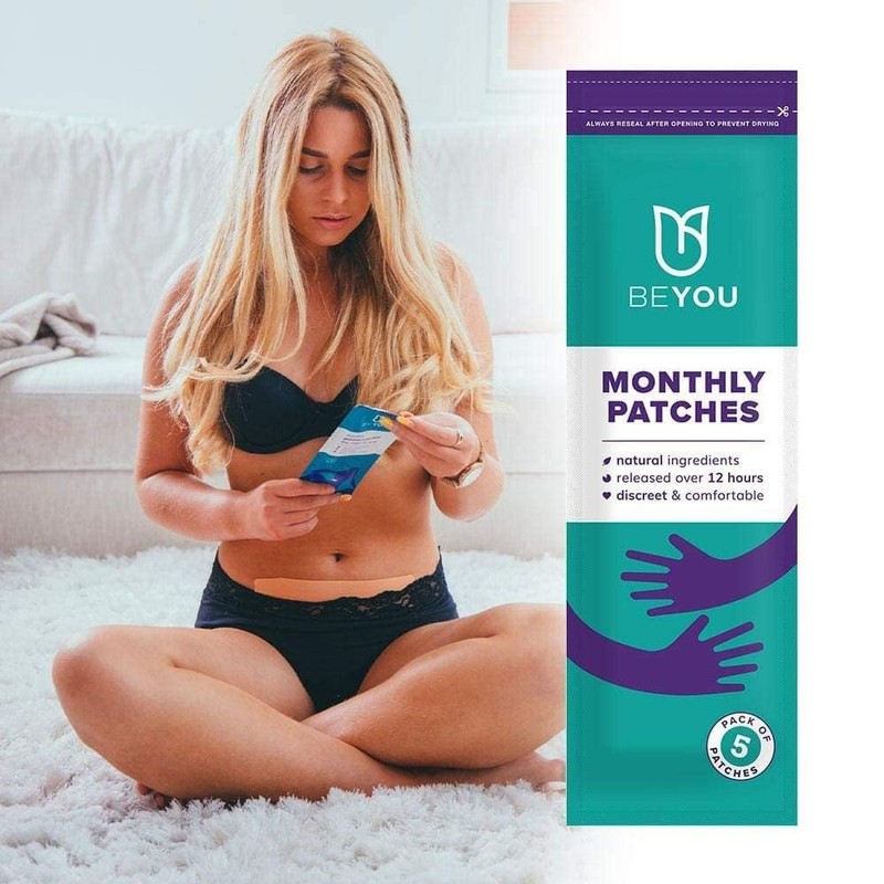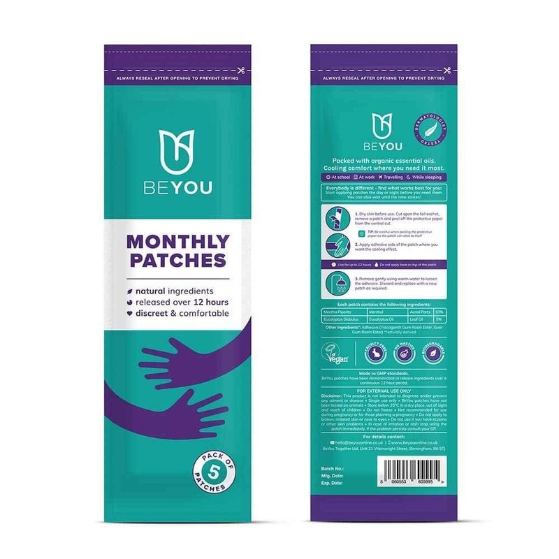 BeYou Natural Cooling Period Cramp Relief Patches, All Natural, analgesic Patches for Period Cramps, Endometriosis, PCOS, Fibroids, IBS, IBD - Contains Eucalyptus Oil and Menthol. NO Heat!