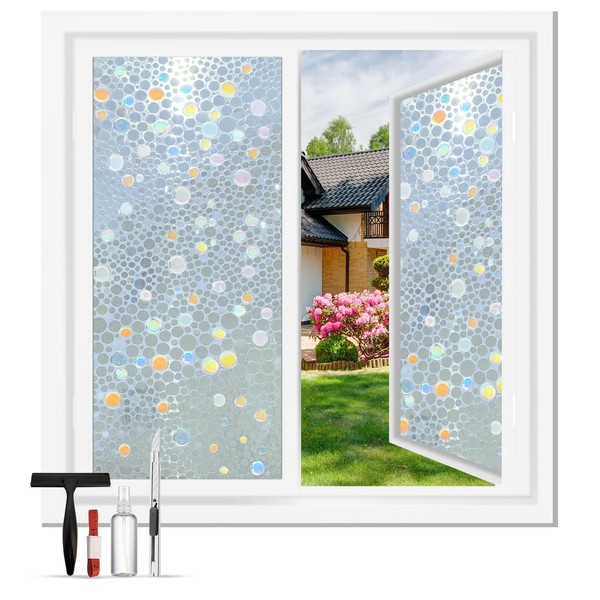 Bezavsgnl Stained Window Privacy Film 3D Rainbow Dazzling Bubble Pattern Decorative Heat Control UV Barrier Static Cling Window Film Non-Adhesive Removable Vinyl Film for Home Bathroom17.5 X 39.4''