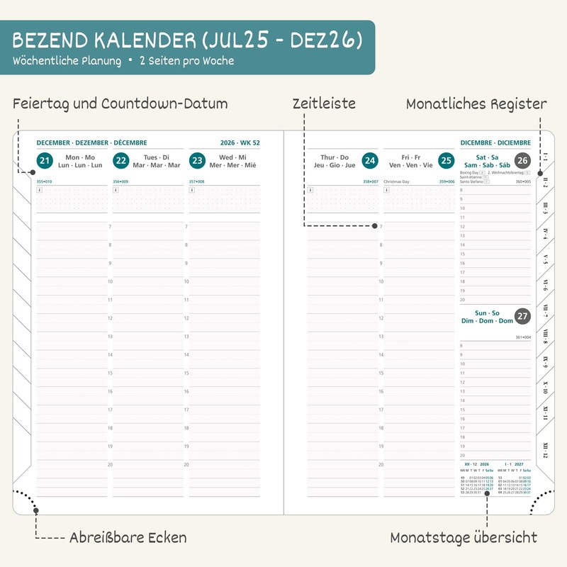 BEZEND Calendar 2025 2026 Weekly Planner A5, 18-Month Book Calendar July 25-Dec 26, PU Leather Hardcover 1 Week 2 Pages with Pen Holder - Dark Green