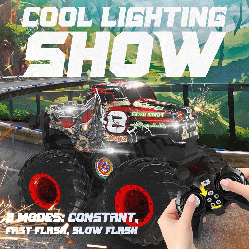 - Vibrant LED Lighting Modes: Illuminate your racing adventures with our monster truck's stunning LED lights, showcasing three dazzling modes: steady glow, rapid flash, and soothing slow blink. The vibrant colors add a futuristic touch to every drive, making it a standout dinosaur toy for kids 3-5 and a top choice among toys for 4-year-old boys. The LED display not only enhances visibility but also elevates the overall gaming experience.