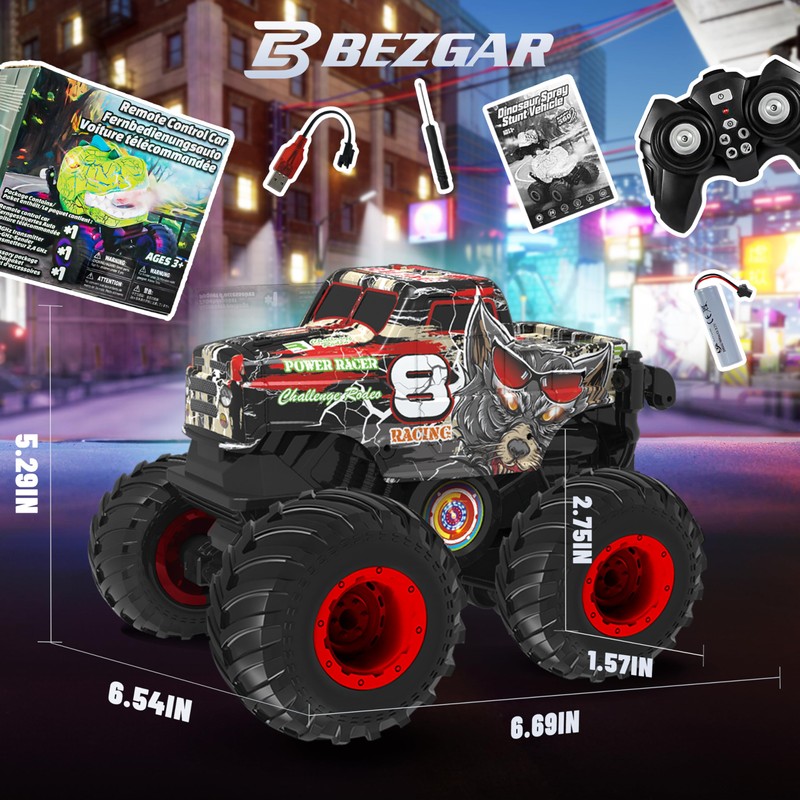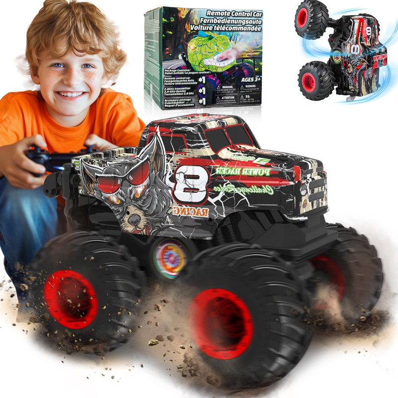 - 360° Spins & Standing Wheelies: Prepare for a stunt-filled ride with our remote control monster truck, featuring incredible 360° rotations and awe-inspiring standing wheelie tricks. Perfect for monster trucks for boys age 4-7, this monster truck remote control car showcases a thrilling array of maneuvers that will captivate the hearts of young adventurers and dinosaur toy lovers alike. It's the ultimate remote control car for boys 4-7 who crave for excitement and daredevil stunts.