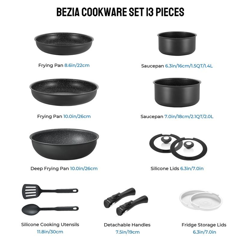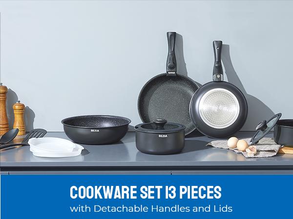 BEZIA Induction Cookware Set 10 Pieces/13 Pieces, Nonstick Pots and Pans Set with Removable Handles, for All Hobs, Stackable Design, Dishwasher/Oven Safe, PFAS Free - 13 Pieces: 13 Pieces