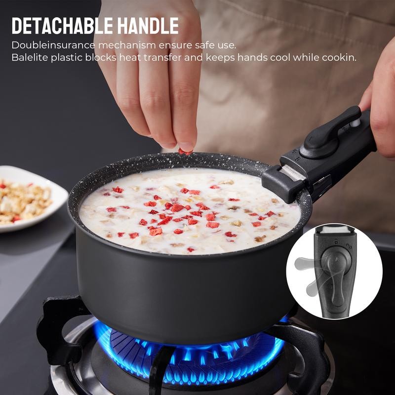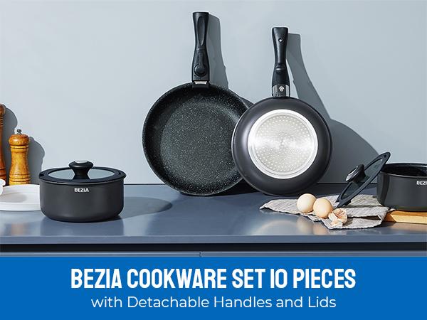 - 10-Piece Multifunctional Cookware Set - Includes 2 saucepans (1.5 and 2.1qt), 2 frying pans (8.6 and 10 inches), 2 detachable handles, 2 silicone lids, and 2 sealing lids for convenient storage or refrigerator storage.