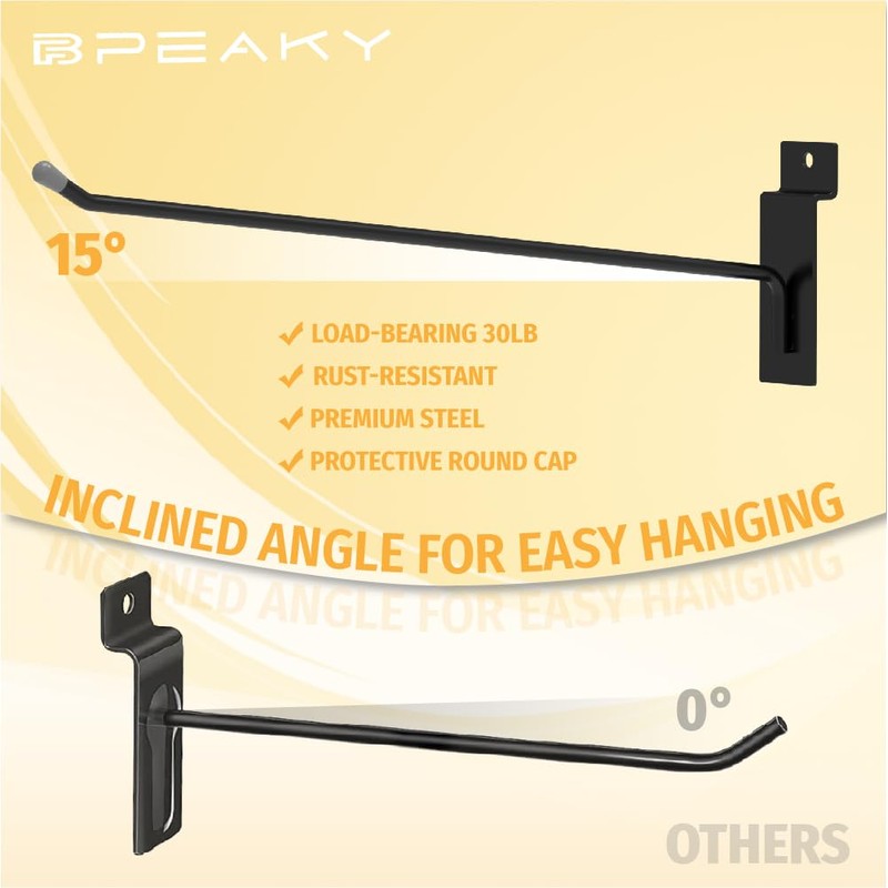 - Premium Quality: Our premium high-quality slatwall hooks are expertly crafted from top-grade steel, ensuring exceptional strength and durability to support heavy loads up to 30 lbs. They offer a reliable and efficient storage solution for various items, from tools and gardening equipment to sports gear.