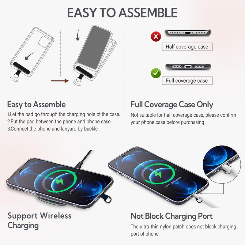 • 2 x Durable Pads&No Block Charging Port: Universal cell phone chain Made of sturdy fabric and metal D-buckle. It has been tested many times and won't break even if you tear it hard. Therefore, you don't have to worry about your phone falling off suddenly. The ultra-thin tear-resistant pad supports both wired and wireless charging without removing it.Cell phone strap suitable for all smartphones with a full-coverage case. Please note that it does not support half-coverage phone cases