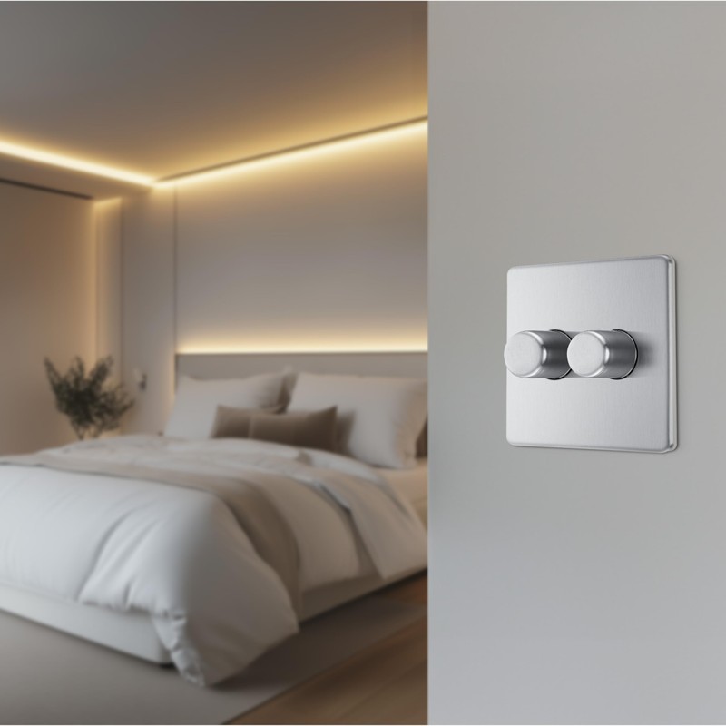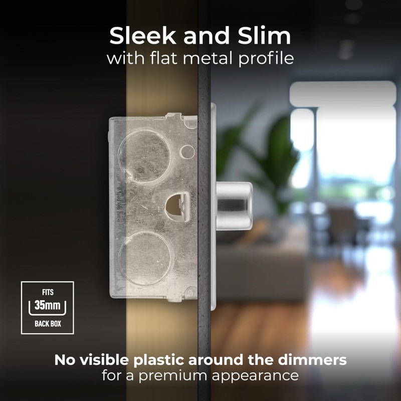 • BG Electric Screwless Slim Line Brushed Steel Dimmer Switch has gently rounded corners, a round edge switch with a screwless flat plate - for a clean look that exudes modern elegance