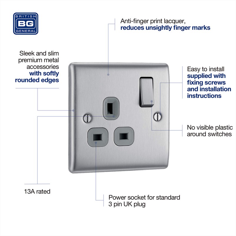 • SLEEK AND SLIM BRUSHED STEEL SINGLE SWITCHED POWER SOCKET: From BG Electrical, has softly rounded corners and colour matching fixing screws – combining quality with modern elegance
