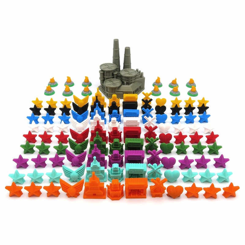 - Set of 121 pieces: jetons de bâtiments, de pouvoir, de popularité et d'étoiles pour chaque faction