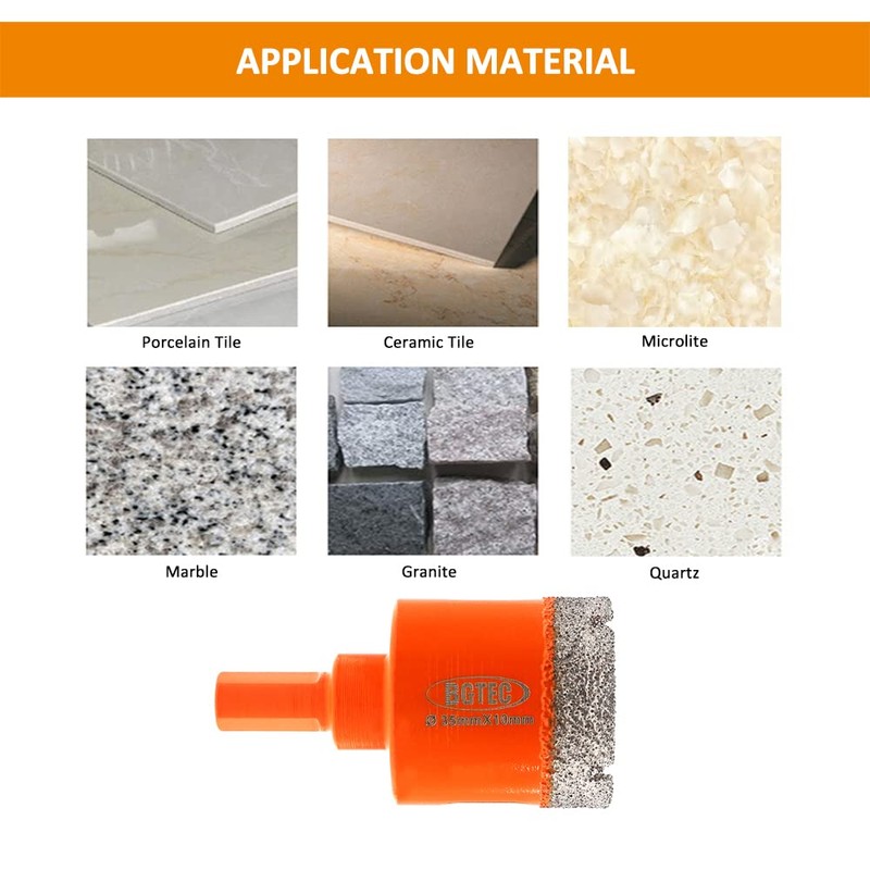 - 【Size】Diameter of 9 drill bits:1/4"+5/16"+3/8"+4/5"+1"+1-1/4"+1-3/8"+1-3/4"+2"(6/8/10/20/25/32/35/43/50MM),Triangle shank. For Ceramic Tile,Porcelain Tile,Marble,Granite,Artificial Stone,Stoneware,Microcrystalline stone,Quartz.
