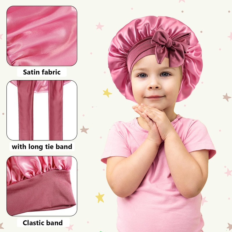 - High Quality Soft Satin Material: Our silk baby bonnet is made of satin material, smooth, glossy, soft, comfortable, washable & no fade. Satin bonnet for sleeping can feel soft and comfortable kid's head, not only protect the hair well, prevent frizz and tangles, and reduce breakage and fall.