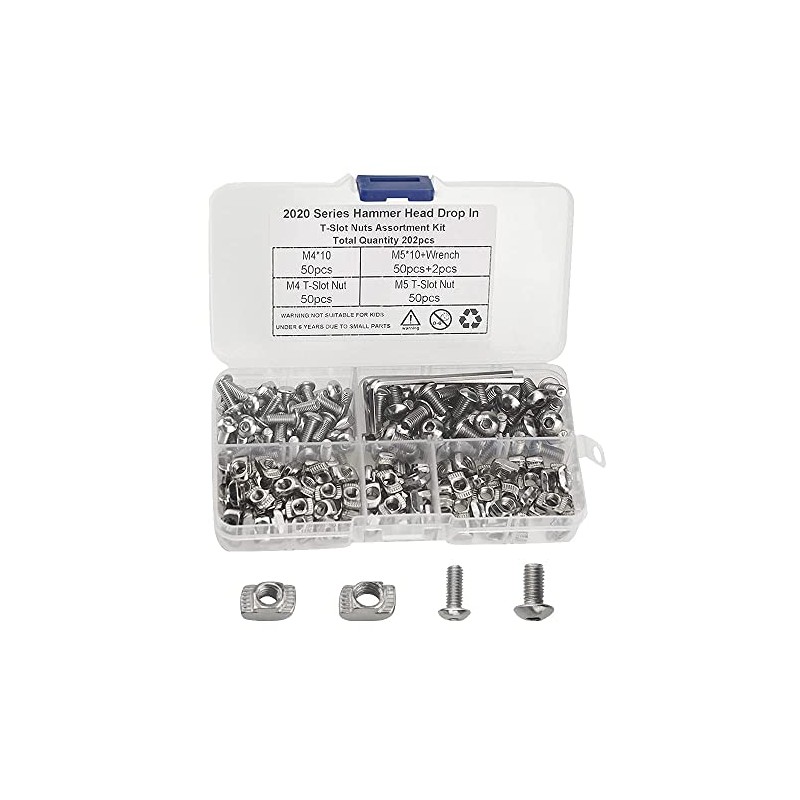 BGTXINGI 200Pcs M4 M5 T Nuts Hammer Head Fastener Nut Drop In T Slot Nut Assortment Kit Nickel Plated Carbon steel with screws and 2 Wrenches for Aluminum Profile