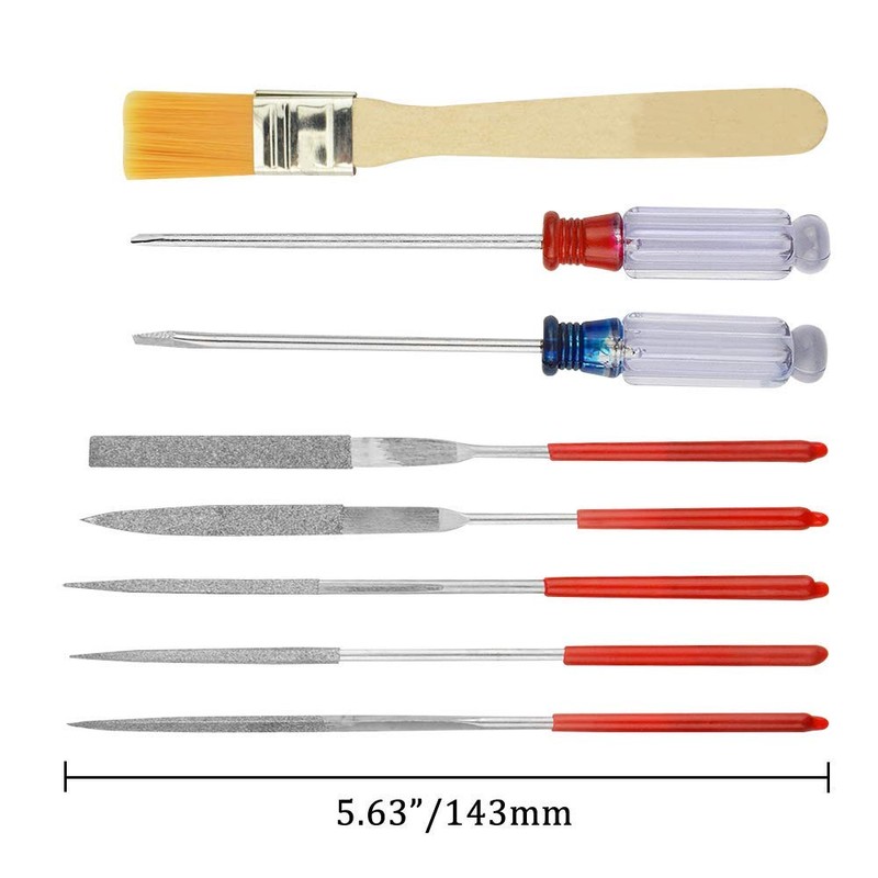 - GREAT AUANTITY: 5pcs Tweezers (4 straight, 1 bent), 1 set of spare blade, 1pcs engraving pen knife, 2pcs double-sided polished block, 5pcs file, 1pcs side cutting plier, 2pcs screwdriver, 1pcs steel ruler, 1Pcs x polishing block, 1pcs brush, 1pcs yellow model separator (a box blade to open model boxes and unravel the already-spliced model parts).