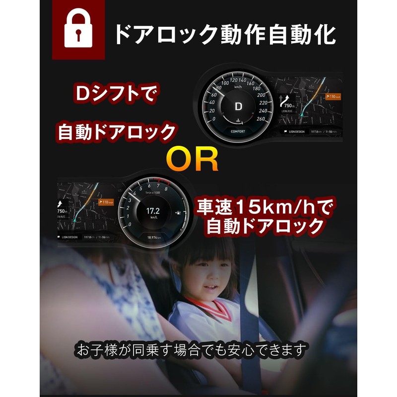 - 5 Functions: 1, auto door lock when driving (car speed 15 kilometers or handbrake disconnection); 2, door lock unlock (with handbrakes); 3, door open-linked hazard flashing; 4, Hazard flashing with R shift; 5, automatic lock with sudden brake. *Note: Due to vehicle specifications and individual differences, the hazard interlocking function may not be used
