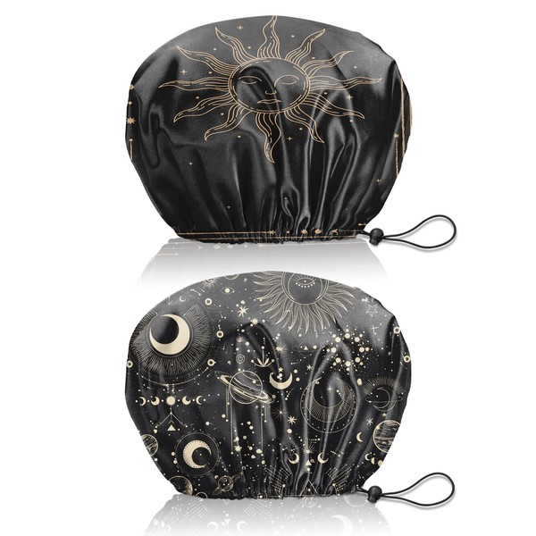 BHAHB 2 PCS Shower Cap Reusable Waterproof Double Layer Elastic Adjustable Hair Bath Caps for Girls Women Cute Aesthetic-Sun Moon