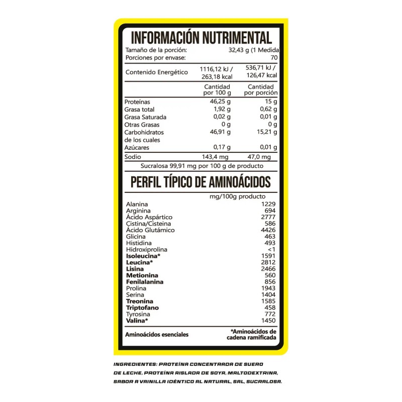 Cada porción entrega una dosis potente de proteína de alta pureza 💪, indispensable para la síntesis muscular, el mantenimiento de masa magra y el rendimiento físico. Además, aporta naturalmente BCAAs y aminoácidos esenciales 🔬, que ayudan a combatir el catabolismo muscular y maximizan tu esfuerzo en cada rutina.