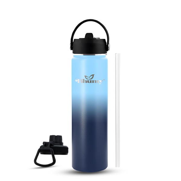 Bhumy Stainless Steel Water Bottles – 24oz Double Wall Stainless Steel Insulated Water Bottle – Water Bottle with Straw and 2 Caps – Leakproof Sports Water Bottle Water for Gym, Office, Travel