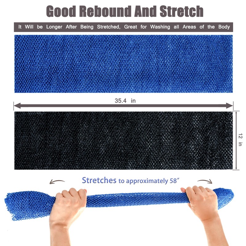 - ?Superb Rebound and Stretch?African body scrubber net is about 35.4 inches long and 12 inches wide, with elasticity, it can reach up to 58 inches long after stretching. Hard-to-reach areas on the back can cause skin problems and discomfort, while the stretchable african bath mesh cleans every inch of skin for the best bathing experience.