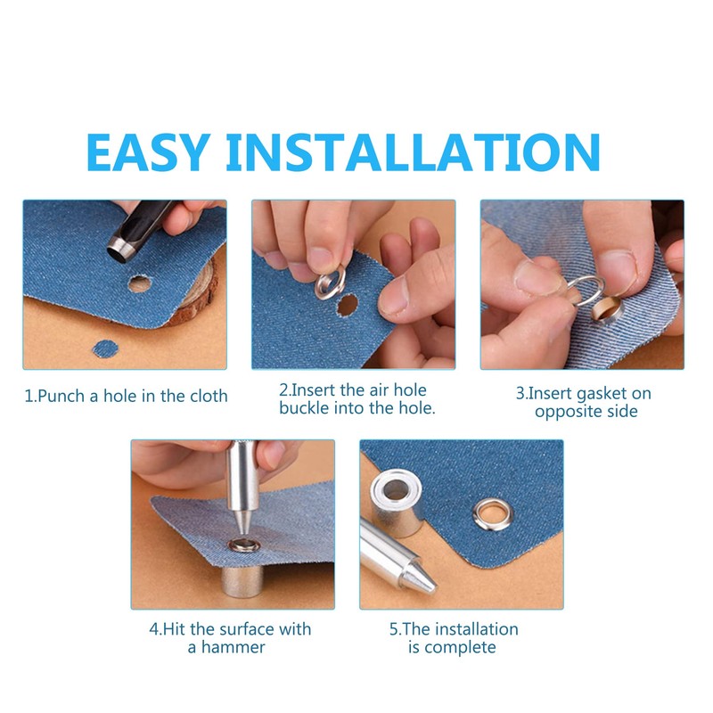 - Easy to use - This grommets eyelets kit come with installation tools, punch holes in place with the hole cutter, then fix the grommets eyelets in place with the install tool and the base.