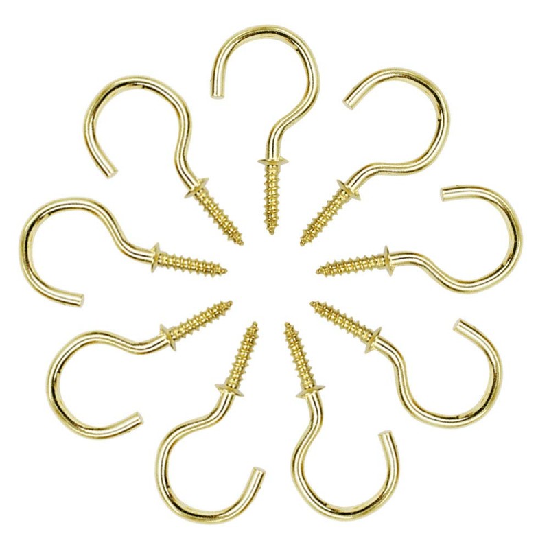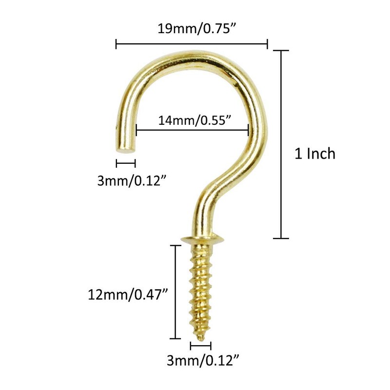 **Features:** 1.Small screw eyes are perfect for hanging Light and small items like necklace, photos etc. 2.Each hook has a blunt end, ideal for indoor and outdoor projects, in sleet, rain or humidity. 3.Copper plated steel resists rust and corrosion and ensures reliable and consistent performance. 4.Perfect for securely hanging light weight items such as lights, curtains, ropes, chains, mugs, feeders, planters , kitchen towels, and more. 5.Screw hooks remain in widespread use in the picture and framing industry and have many applications outside of conventional picture hanging. 6.Easy installation by hand. Very easy twist the screw hooks into wood, plywood or drywall and the steel points bite into swiftly without stripping and provide maximum strength and durability. **Specification:** Color: Golden Screw dia: 3mm/0.1" Inside eye dia:14mm/0.55" Screw Lenght: 12mm/0.47" Overall length:38mm/1.5" Material: Stainless steel,brass plated **Package Included:** 100 x screw-in ceiling hooks