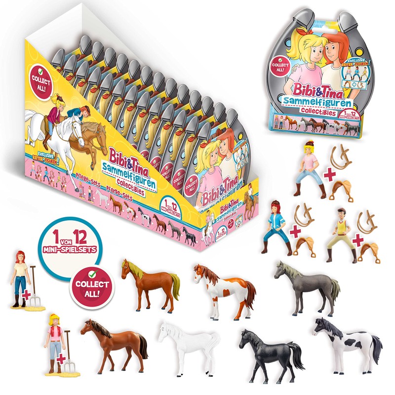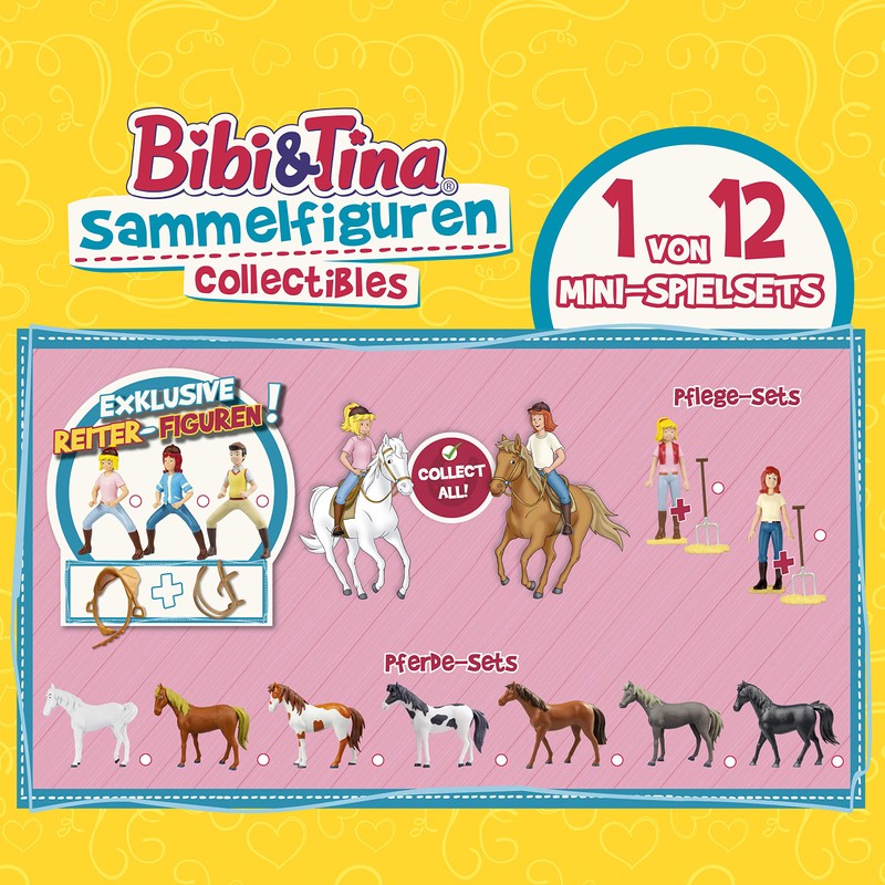 - “1 of 12 possible play sets included in a foil bag + collectors overview. Possible play sets: 1 horse (Sabrina, Amadeus, Maharadscha, Nora, Topsy, Kyra, Pascal) or 1 standing figure with hay and manure fork (Bibi, Tina) or a riding figure with saddle and halter (Bibi, Tina, Alexander).”