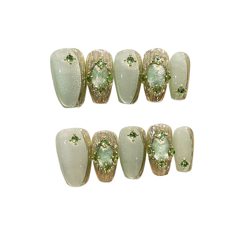 BIBII Nails Handmade Nail Tip Kit, Long 3D Nails, Green, Floral Pattern, Spring and Summer, Korea, Popular, 10 Pieces, Long False Nails, Cat Eye, Magnet, 100% Handmade Nails for Easy Installation,