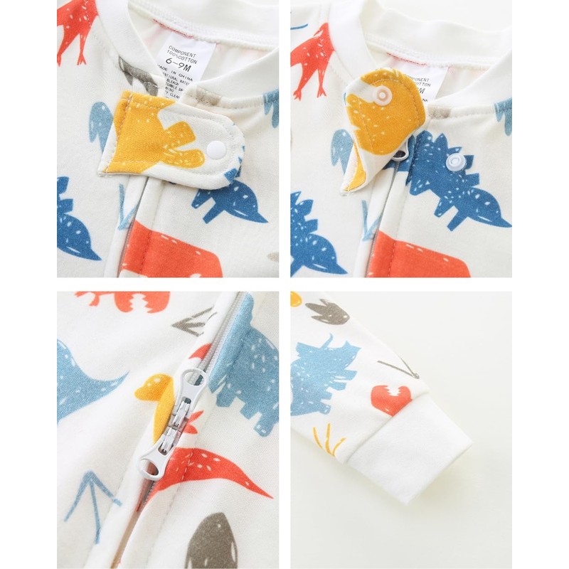 Bibimom Baby Onesie Boy Girl Zip-up Long Sleeve Footie Cotton One-Piece Romper Jumpsuit 0-12 M, Colorful Dinosaur, 6-9 Months