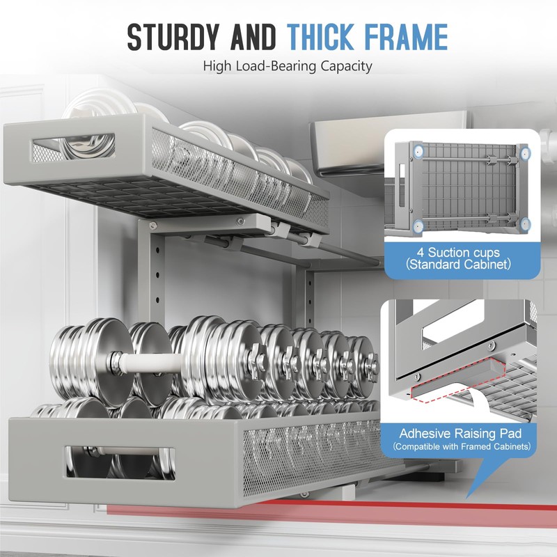• 【2-Tier Pull-Out Design for Easy Access】This under-sink organizer features a double-layer pull-out design, allowing you to easily access items at the deepest part. The upgraded, thickened iron circular sliding rails ensure a smooth and seamless pulling experience, making each use effortless. The unique pull-out locking mechanism effectively prevents the drawers from being completely pulled out, avoiding the risk of items falling or structural damage caused by over-pulling, ensuring safer and more convenient use.