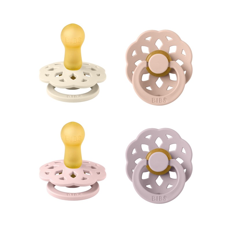BIBS Boheme Soother 4-Pack. BPA Free Dummy Pacifier, Round Nipple. Natural Rubber Latex, Made in Denmark, Size 2 (6-18 Months), Dusky Lilac Mix