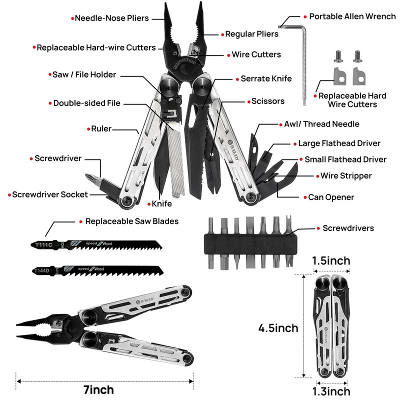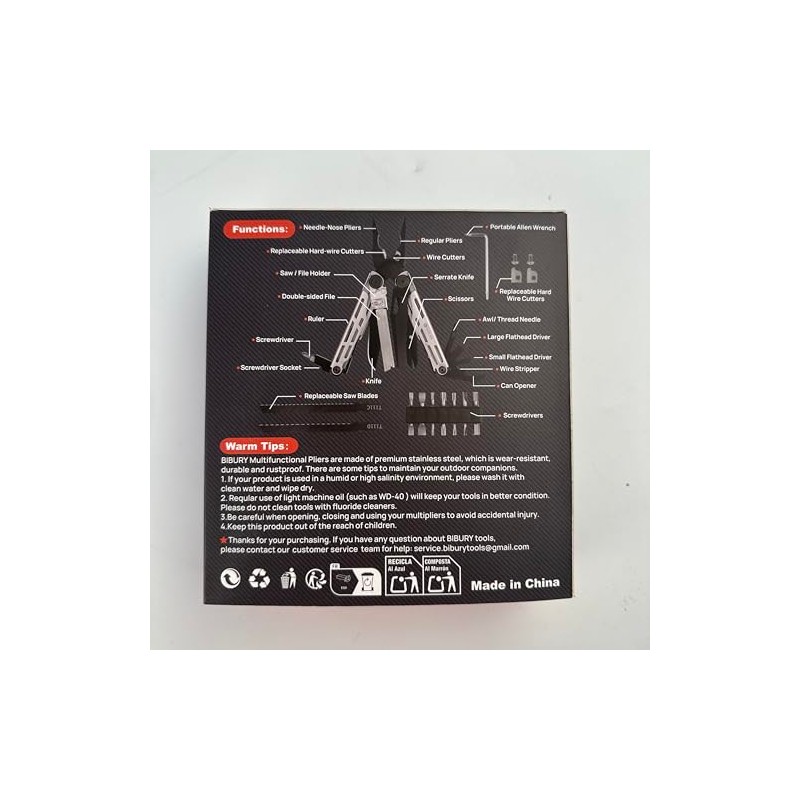 - Upgraded Multi Tool Pro: BIBURY multitool pro includeds tools such as pliers, in screwdriver bits, replaceable hard wire cutter, wire stripper, punch, replaceable saw, scissors, ruler, can opener and bottle opener, files etc Ideal for outdoor activities such as camping, hiking, working outside, having a picnic, DIY and more